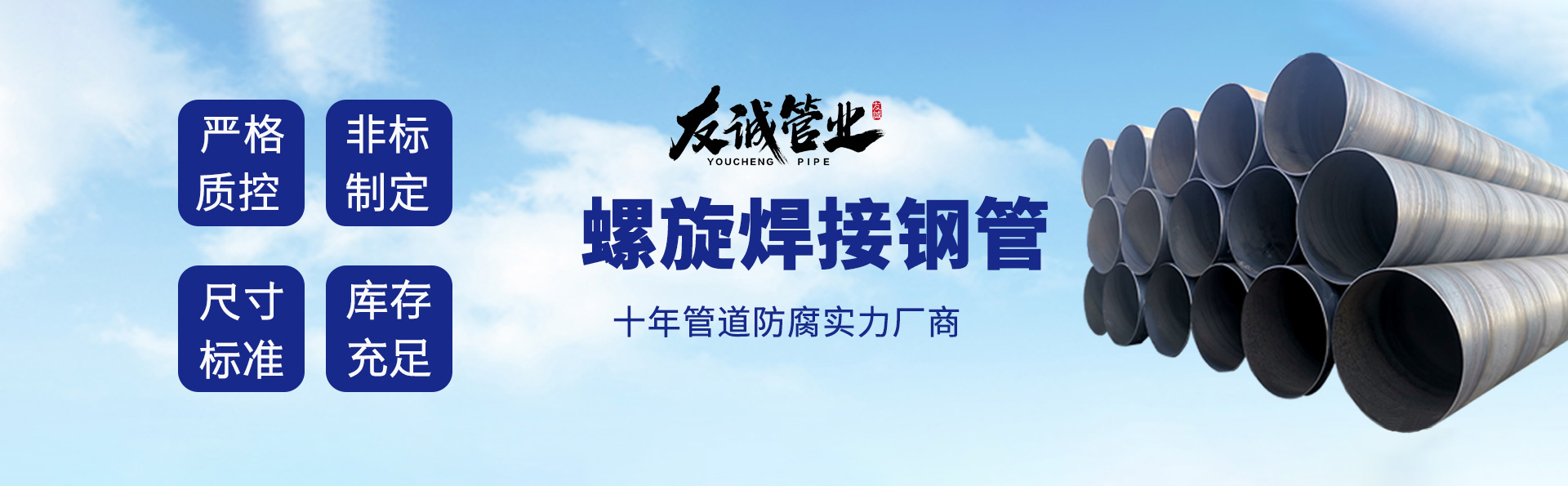 滄州友誠管業(yè)有限公司是一家專業(yè)從事生產(chǎn)防腐涂塑管道及管件于一體的大型企業(yè)。公司注冊(cè)資金8600萬元,位于中國管道生產(chǎn)基地—河北鹽山縣,近靠京滬高速、榮烏高速、黃石高速30公里,高鐵滄州西站40公里,天津國際機(jī)場、濟(jì)南遙墻機(jī)場150公里,為客戶來訪及業(yè)務(wù)發(fā)展提供了便利的交通條件。        鋼管系列:螺旋鋼管、無縫鋼管、ERW直縫焊管、JCOE埋弧焊直縫鋼管、熱鍍鋅鋼管。        涂塑系列:內(nèi)外涂塑鋼管、涂塑復(fù)合鋼…… 了解更多